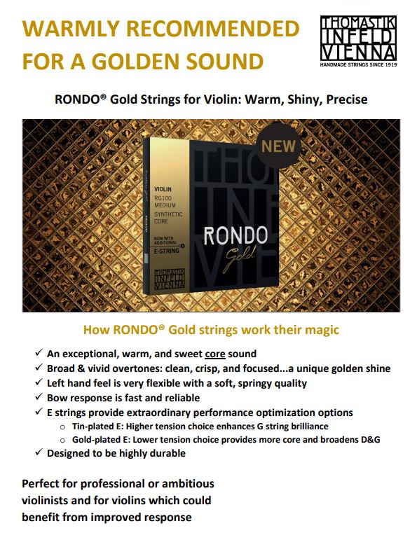 Discover the magic of RONDO® Gold strings with their exceptional warm and sweet core sound, broad and vivid overtones, and unique golden shine. These strings provide a flexible and springy left hand feel, fast and reliable bow response, and extraordinary performance optimization options for the E strings. With a choice of tin-plated E for enhanced G string brilliance or gold-plated E for more core and broadened D&G, these highly durable strings are perfect for professional or ambitious violinists and violins seeking improved response.